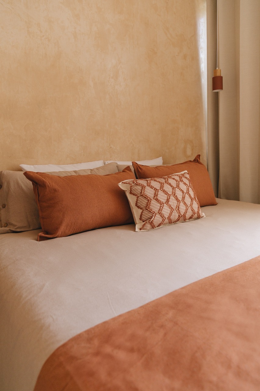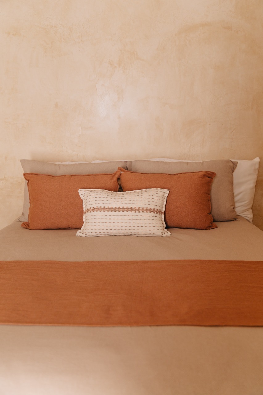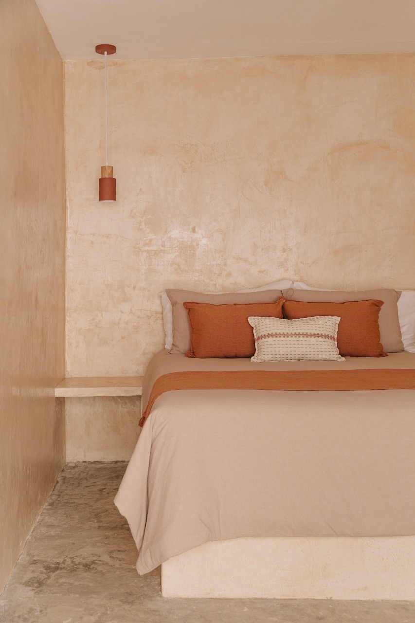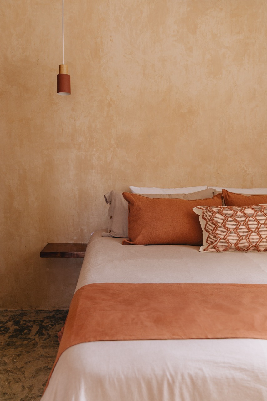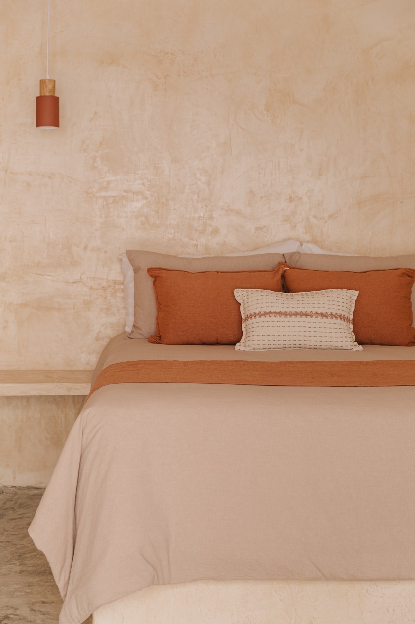 El bedding y los accesorios de mesa son parte de nuestra colección, todo en tonos terracota para no romper con el diseño y atmósfera del lugar.