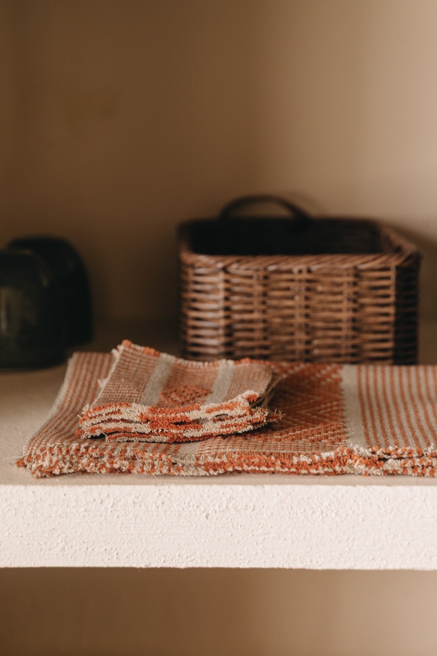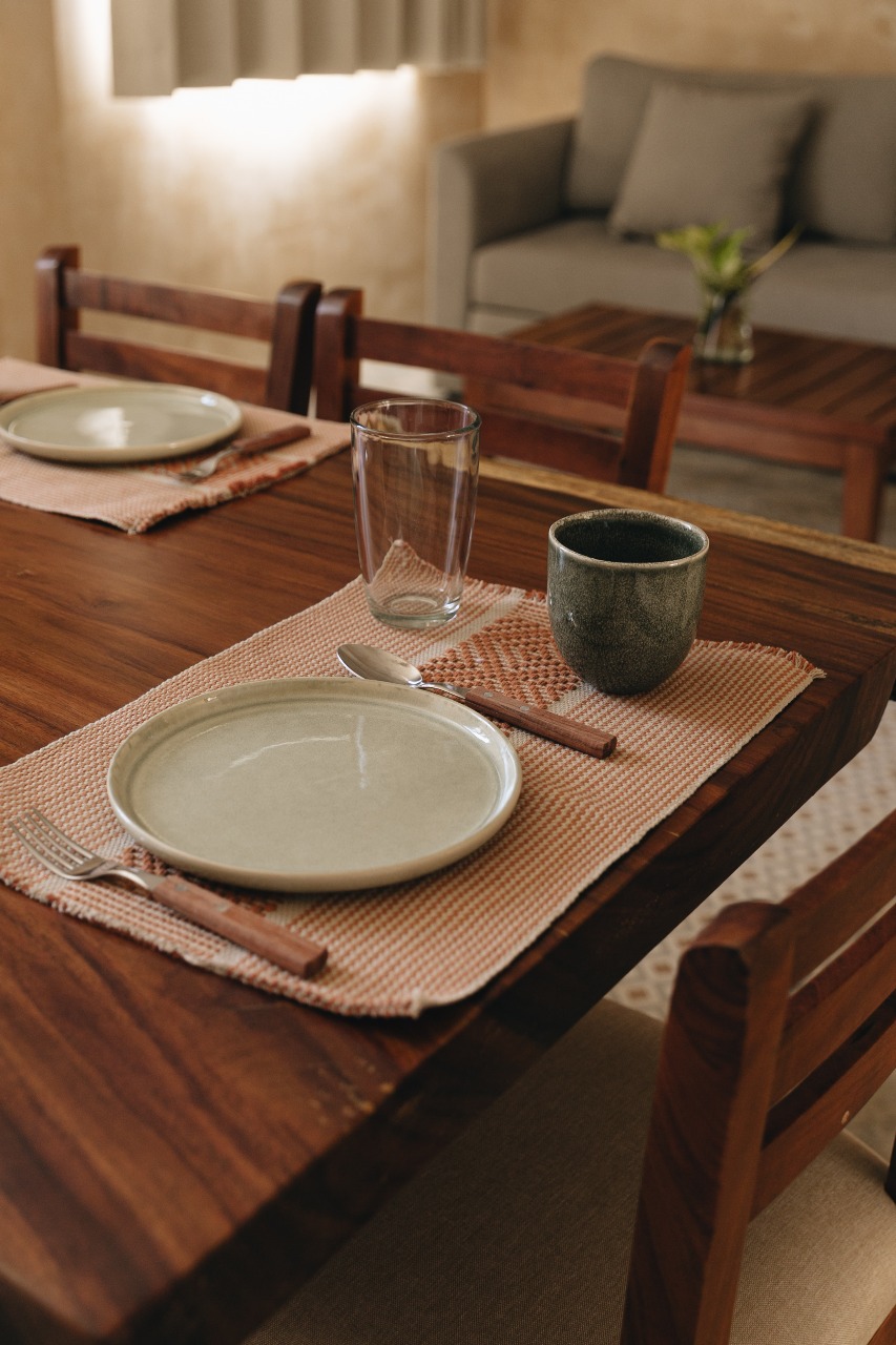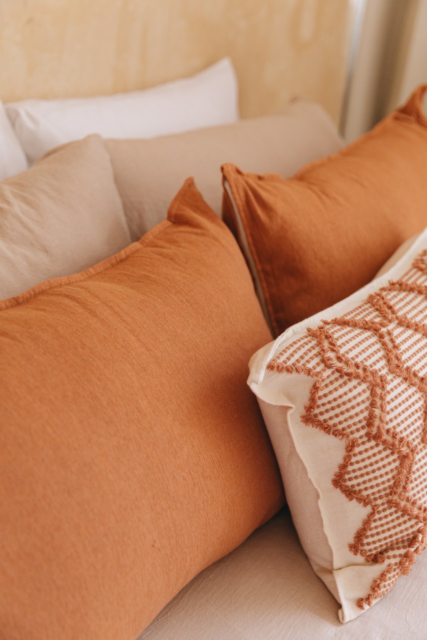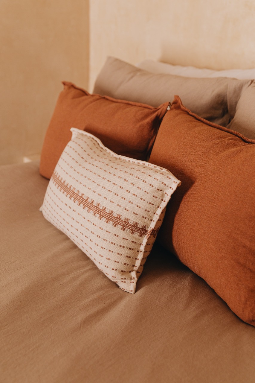 El bedding y los accesorios de mesa son parte de nuestra colección, todo en tonos terracota para no romper con el diseño y atmósfera del lugar.