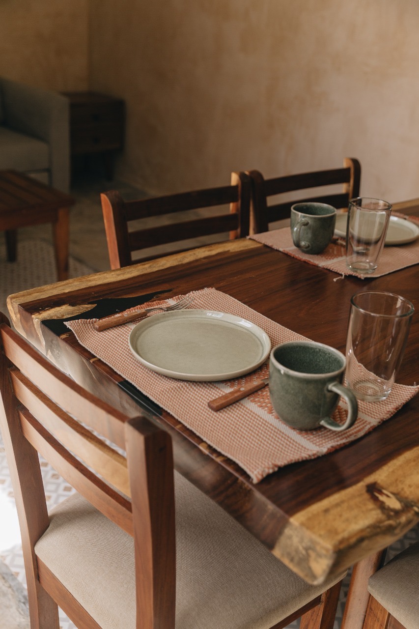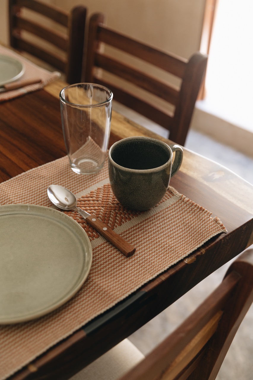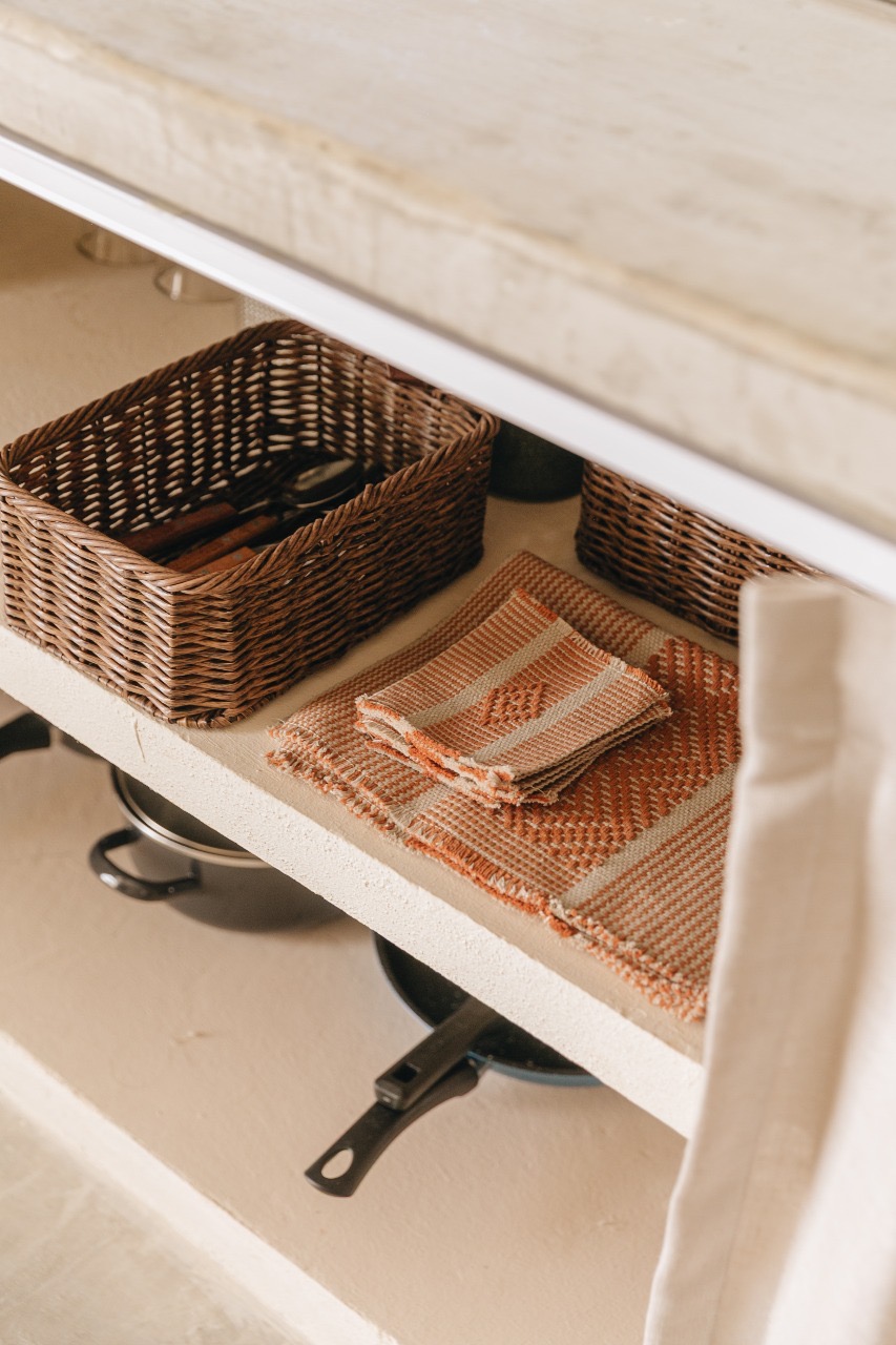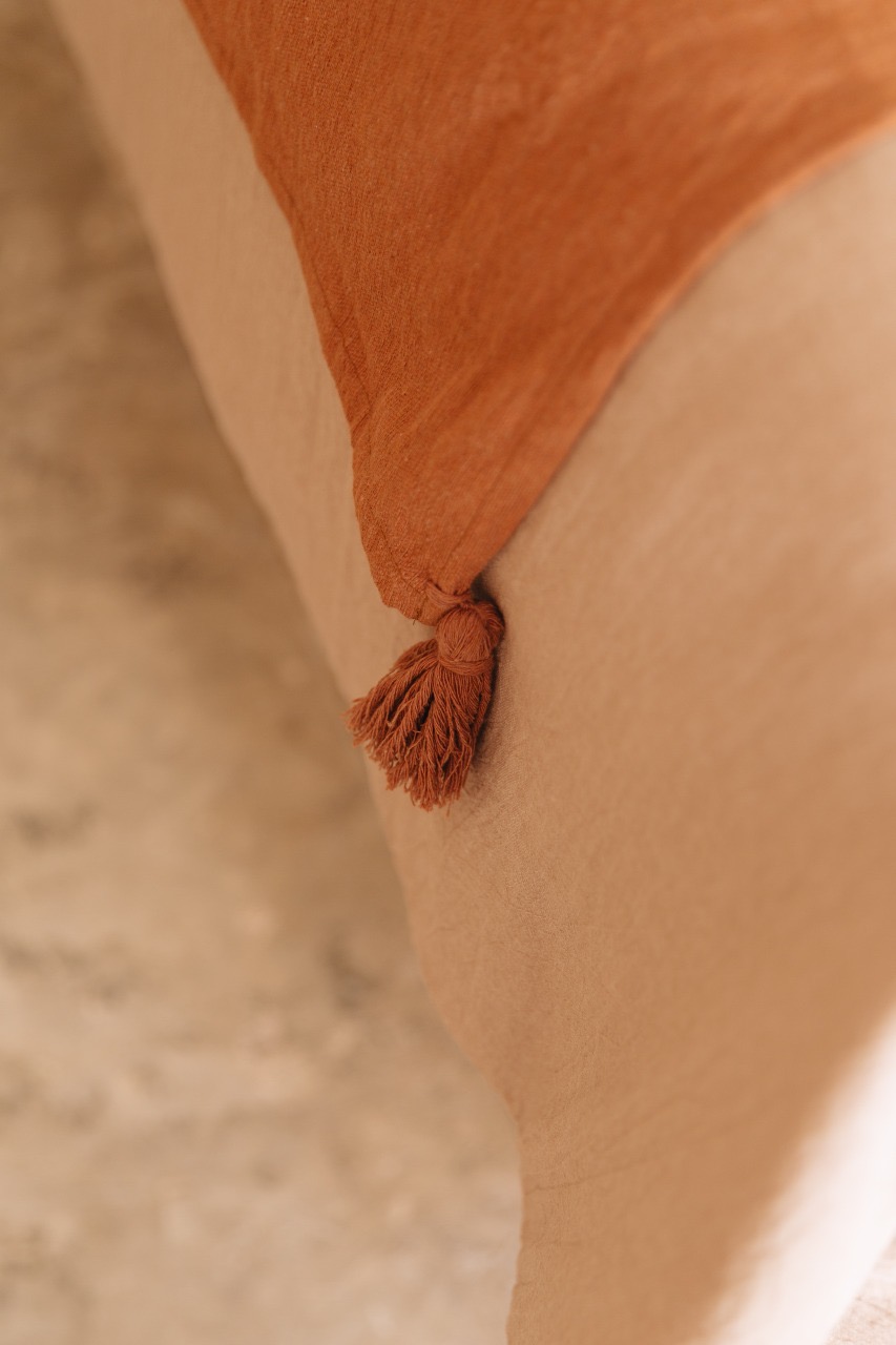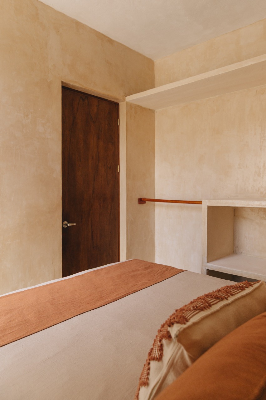 El bedding y los accesorios de mesa son parte de nuestra colección, todo en tonos terracota para no romper con el diseño y atmósfera del lugar.